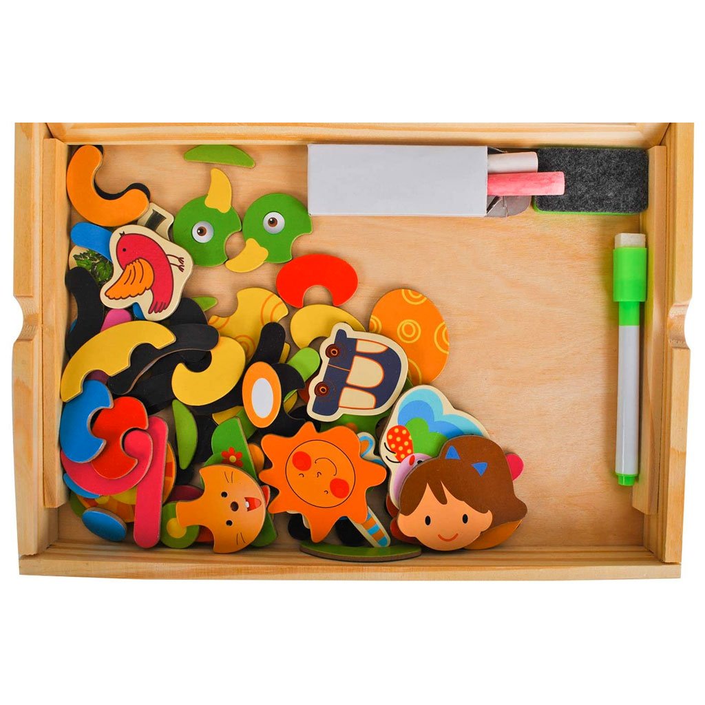 La lavagna magnetica è una scatolina in legno che presenta 2 lati: uno bianco e uno nero. All’interno c’è un contenitore dove sono presenti i magneti di personaggi, animali, oggetti, oltre a pennarelli, gessetti e spugnetta.