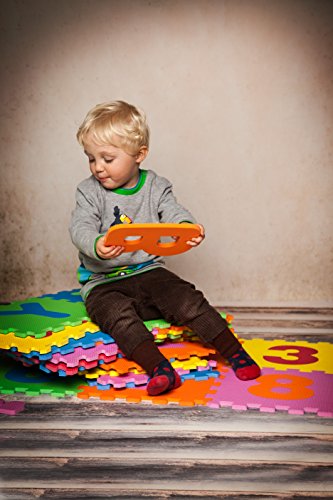Tappetino puzzle con lettere dell’alfabeto e numeri composto da 36 pezzi. Con questo tappetino colorato componibile come un puzzle i bambini imparano numeri e lettere giocando. La fantasia dei bambini corre libera. Il tappetino può essere utilizzato per giocare, come seduta imbottita e base protettiva. Inoltre favorisce la percezione del tatto e il senso di equilibrio. Resistente all’umidità e termoisolante. Con un panno umido è facile pulire il tappetino in gommapiuma. I numeri e le lettere possono essere facilmente rimossi dal tappetino. Dimensioni della singola tessera puzzle: 32 x 32 x 1 cm. Età consigliata: a partire da 10 mesi. Materiale: 80% PE, 20% EVA. Attenzione: non adatto a bambini di età inferiore a 10 mesi. Prima che il giocattolo venga utilizzato dal bambino, la confezione e tutti gli elementi di fissaggio devono essere rimossi. Tenere lontano dal fuoco. Piccole parti staccabili. Pericolo di soffocamento. Si raccomanda di conservare la confezione in quanto contiene informazioni importanti.